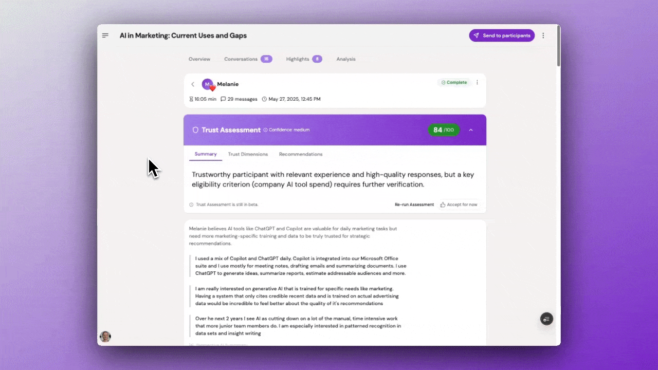 Trust is everything in research. With our new credibility scoring system, every interview now gets an automatic trust assessment across multiple dimensions. Spot red flags, highlight high-quality insights, and build more credible research—at a glance.